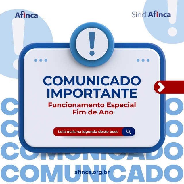 Informamos aos associados que, em razão do período de recesso, o funcionamento da AFINCA no fim de ano ocorrerá da seguinte forma: