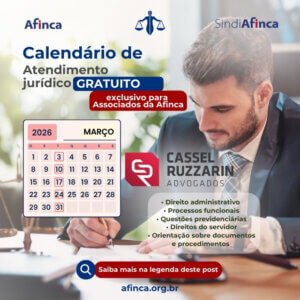 Em parceria com o Cassel Ruzzarin Advogados Associados, a AFINCA oferece atendimento jurídico especializado, com uma equipe experiente, ética e comprometida com a defesa dos servidores públicos. O serviço é voltado para esclarecimento de dúvidas, orientação técnica qualificada e apoio na preservação dos seus direitos.